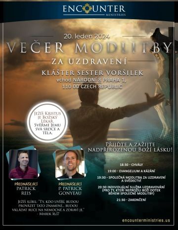 - 20:30 - individuální služba uzdravování (pro ty, kteří neprožijí Boží dotek během společné modlitby)